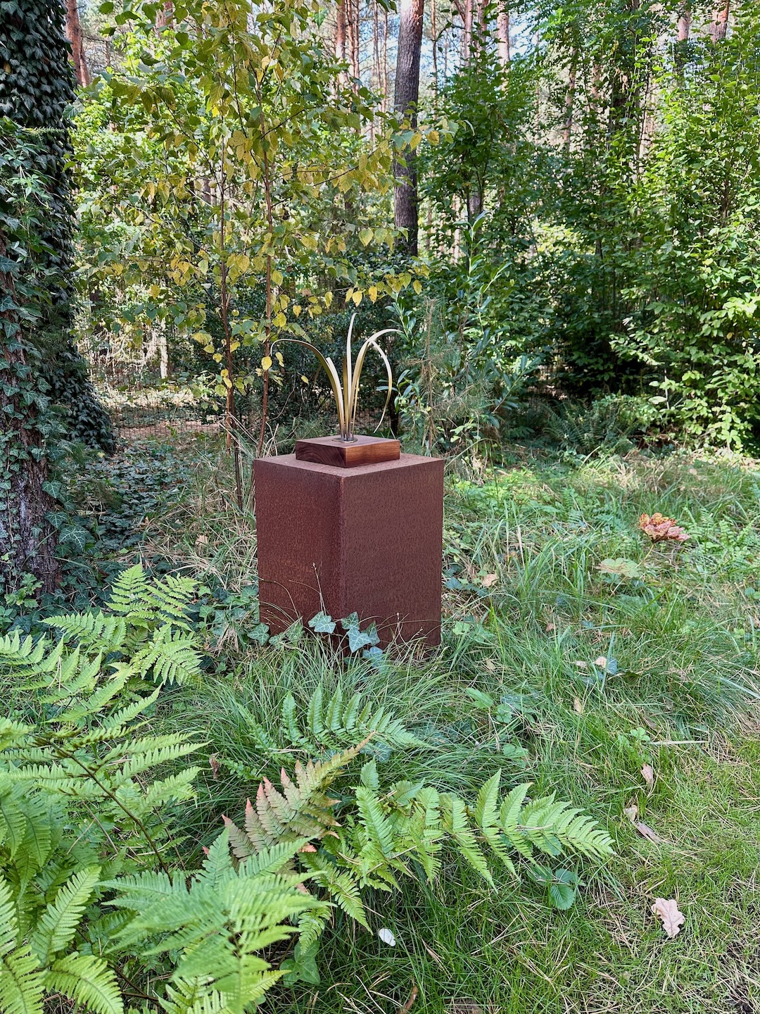 Kształt traw wycinam ręcznie piłką włosową, zaginam blachę, część dolna jest patynowana i płynnie przechodzi w połysk. Rzeźba jest zabezpieczona woskiem i umieszczona na podstawie z orzecha czarnego.